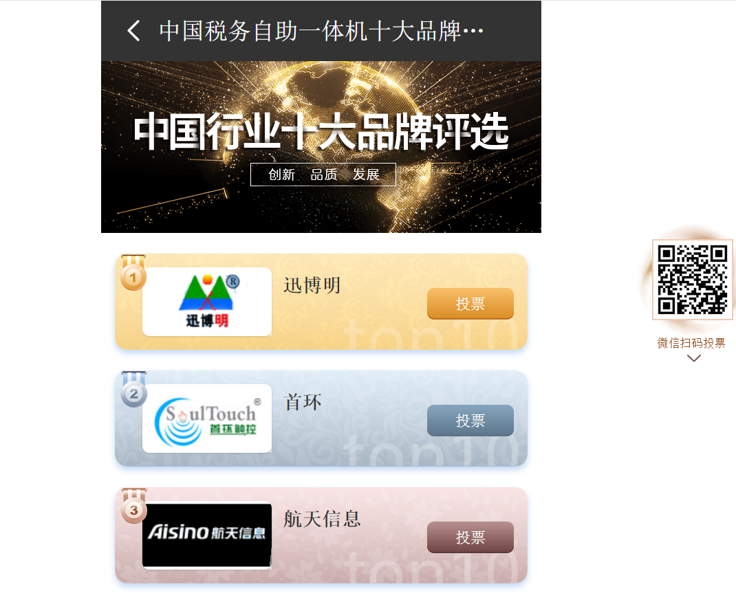 加強(qiáng)品牌建設(shè),有利于推動(dòng)經(jīng)濟(jì)大國(guó)向經(jīng)濟(jì)強(qiáng)國(guó)轉(zhuǎn)變,有利于滿足人們更高層次物質(zhì)文化需求,有利于弘揚(yáng)中華文化、提升中國(guó)形象。安徽迅博智能科技有限公司以"助力中國(guó)稅務(wù)自助一體機(jī)品牌發(fā)展,傳播企業(yè)品牌價(jià)值"為宗旨,為消費(fèi)者選購(gòu)和經(jīng)銷商經(jīng)營(yíng)提供品牌選擇依據(jù),憑借可信品牌數(shù)據(jù)庫的優(yōu)勢(shì),以大眾網(wǎng)友評(píng)價(jià)點(diǎn)評(píng)、品牌滿意度調(diào)查、用戶體驗(yàn)度為基礎(chǔ),結(jié)合有關(guān)企業(yè)信息、媒體報(bào)道、研究機(jī)構(gòu)進(jìn)行綜合評(píng)價(jià),實(shí)時(shí)推出各行業(yè)中品牌美譽(yù)度高、產(chǎn)品質(zhì)量?jī)?yōu)、企業(yè)信用好的行業(yè)十強(qiáng)品牌。